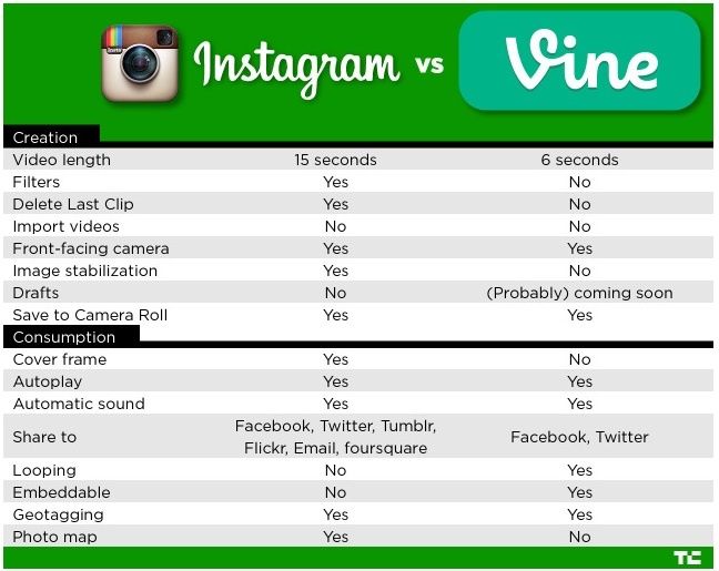 Ma se ti interessa confrontare tutte le caratteristiche tecniche dei video Instagram vs. Vine, questa scheda di Techcrunch, può esserti utile: