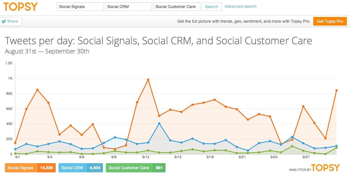 Al fine di verificare quanto i Social Signals siano oggetto di conversazioni in rete, ho fatto una breve ricerca confrontandone 'la voce' con due parole chiave di altrettanto interesse: Social CRM e Social Customer Care.