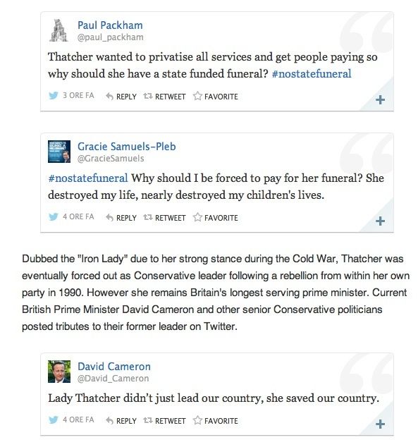 L'annuncio del governo Britannico che i funerali della Lady di ferro avverranno in forma 'solenne', quindi in parte a spese dello Stato, ha generato una immediata polemica che si è rapidamente amplificata grazie ai Social Network.